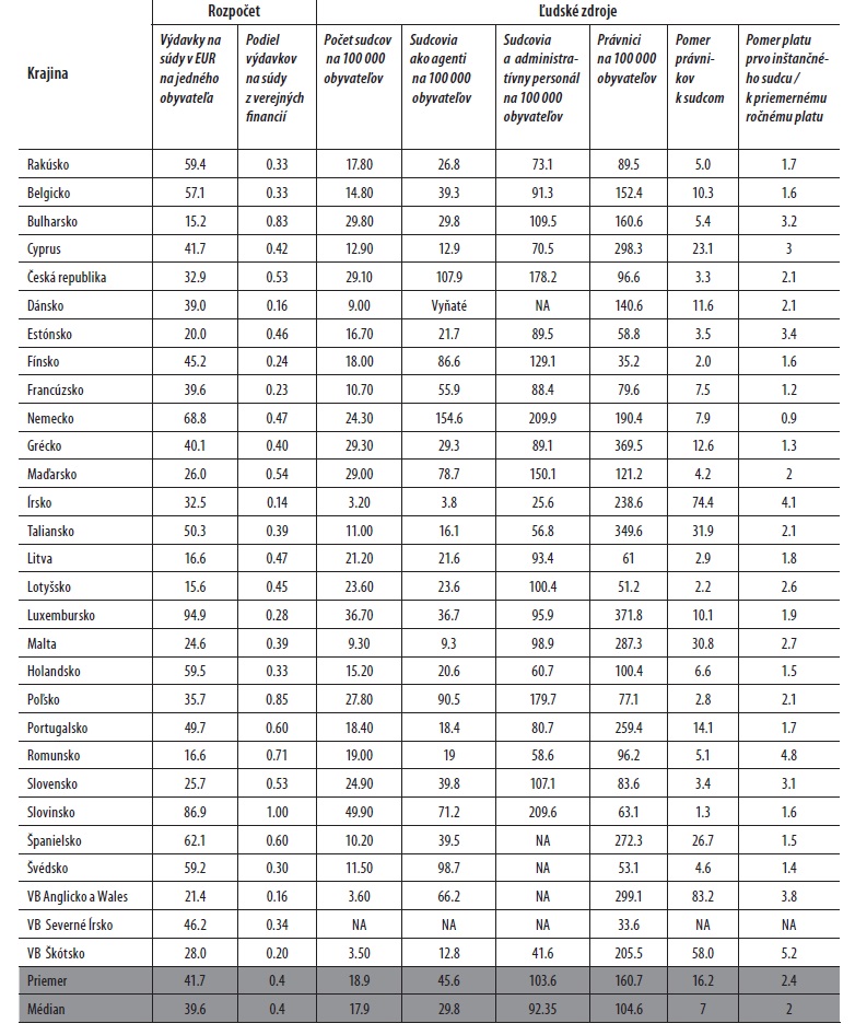 • výdavky na súdy (ako % z verejných výdavkov) – 6. miesto (po krajinách ako Bulharsko, Maďarsko, Rumunsko, Španielsko a Portugalsko),